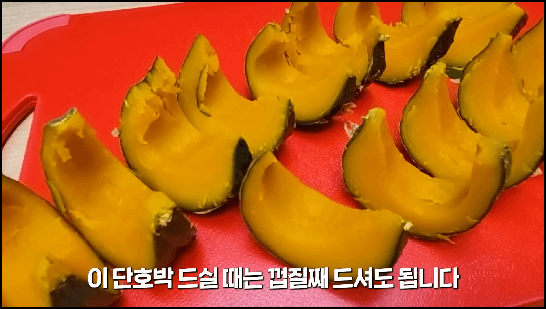 10분 정도 식힌 후 먹기 좋은 크기로 잘라줍니다. 그러면 단호박 찌는법으로 만든 단호박 완성입니다.