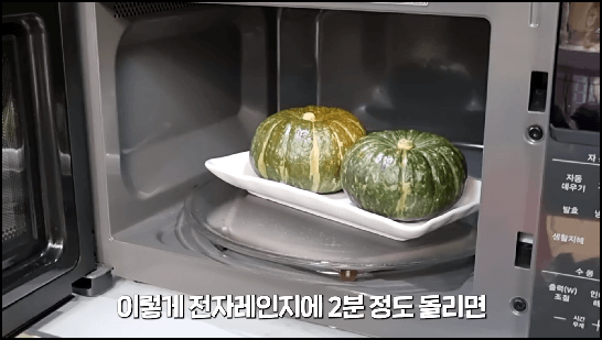 깨끗이 씻은 단호박은 전자렌지에 2분 정도 돌려줍니다. 단호박은 단단해서 칼질하기가 쉽지 않은데 이렇게 전자렌지에 돌려주면 썰기도 쉽고, 씨를 긁어낼 때도 수월합니다.