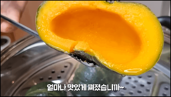 이대로 뚜껑을 닫고 8분 정도 쪄 주면 됩니다. 단호박이 큰 것이라면 10분 정도 찌면 됩니다.