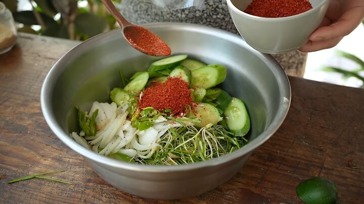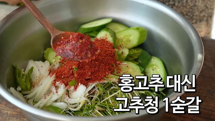 고춧가루 2숟갈을 넣고, 홍고추를 다져서 넣거나, 고추청이 있으면 고추청 1 숟갈을 넣어주세요.