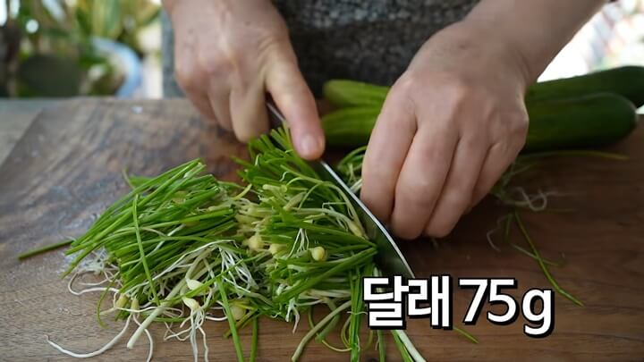 달래는 먹기 좋은 크기로 잘라줍니다. 너무 짧지 않은 길이로 잘라주세요. 백오이 작은 것 2개는 어슷 썰기로 썰어주세요.