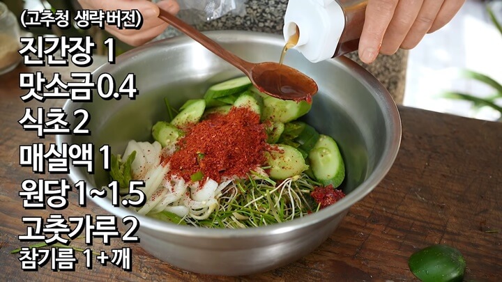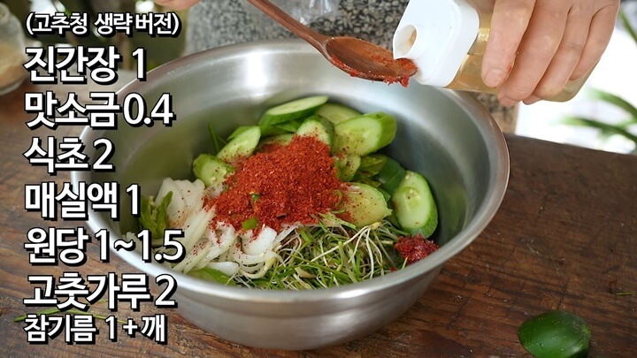 새콤한 맛이 돌도록 식초 2숟갈을 넣고, 매실액 1 숟갈, 참기름 1 숟갈, 깨소금 적당량, 설탕 1~1.5 숟갈을 넣고 살살 털어가면서 손으로 무쳐주세요.