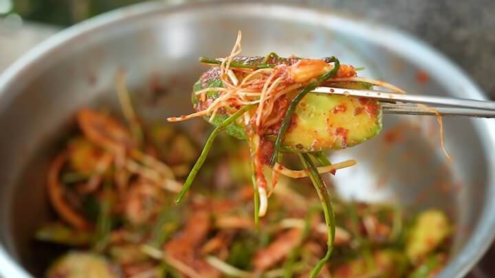 살살 무쳐주면 달래무침 완성이에요. 달래무침만 먹으면 알싸하고 매운맛이 돌아 먹기 힘든데, 오이가 함께 들어가 상큼하고 아삭아삭 먹기가 훨씬 좋아요.