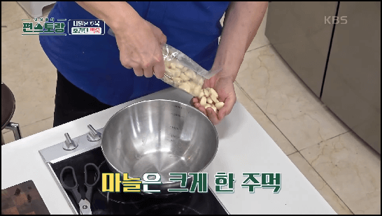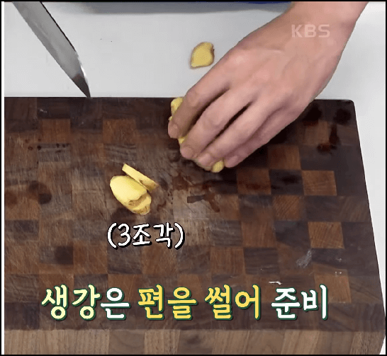 생강은 편 썰어서 3~4조각 정도 넣으면 되는데, 생강은 필수로 넣는 것이 좋습니다. 그리고 마늘은 한 주먹 정도 넣어줍니다.