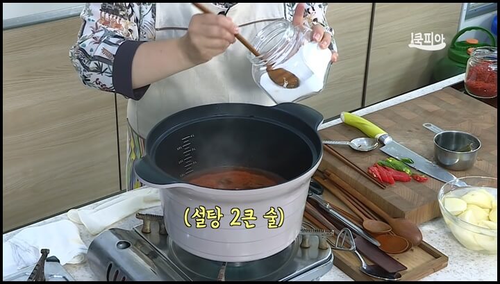 1) 양념장이 부글부글 끓고 있을 때 감자를 먼저 넣어 줍니다.