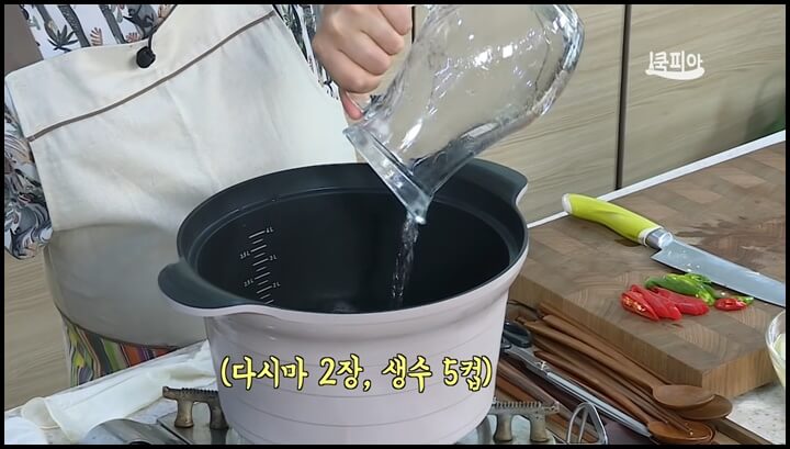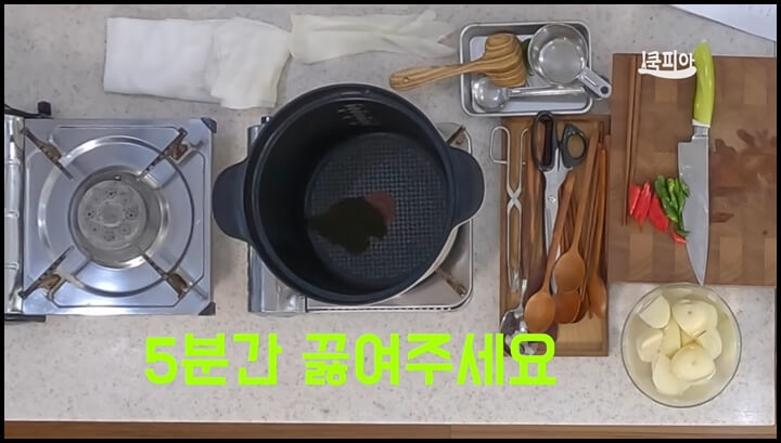 1) 냄비에 물 다섯 컵을 붓고 다시마 2장을 함께 넣어 줍니다. 다시마는 사방 5cm 짜리 건다시마를 넣으면 되고, 이대로 5분간 끓여줍니다.