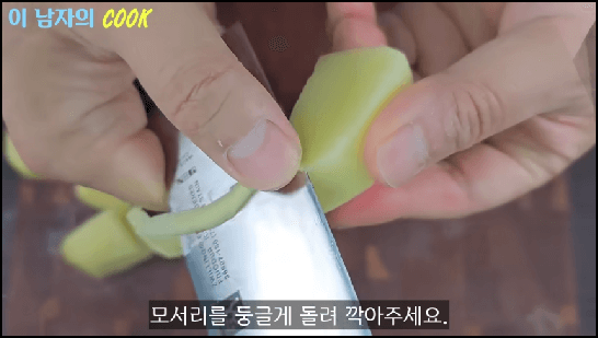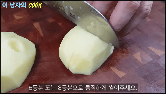 감자 2개는 껍질을 벗긴 후 깨끗이 씻어서 먹기좋은 크기로 썰어줍니다. 6~8등분으로 잘라준 후 모서리를 돌려깍기 해 줍니다. 그러면 모서리부분이 으깨져서 국물이 탁해지는 것을 막을 수 있습니다.