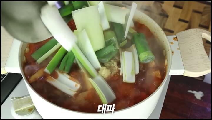 대파는 길게 길게 썰어서 준비하는데, 굵은 대파는 반으로 가른 후 잘라주면 됩니다. 비주얼을 위해 두꺼운 통대파를 추천하는데요, 통대파를 넣어주면 보기에 더 먹음직스러워 보입니다.