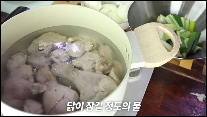 냄비에 물을 끓인 후 닭을 초벌 삶기해주는데, 초벌 삶기 하는 이유는