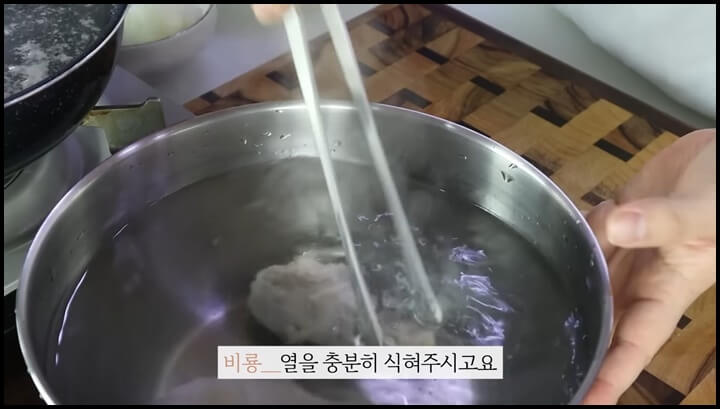 물이 끓으면 닭을 넣고 물이 다시 끓기 시작하는 시점부터 5분간 삶아줍니다. 삶은 후에는 찬물에 1분 정도 담가서 열을 충분히 식혀줍니다.