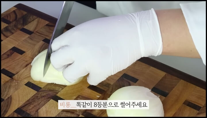 양파 1개도 8등분으로 잘라줍니다. 당근은 1/4개만 준비해서 반달 모양으로 두툼하게 썰어서 준비합니다.