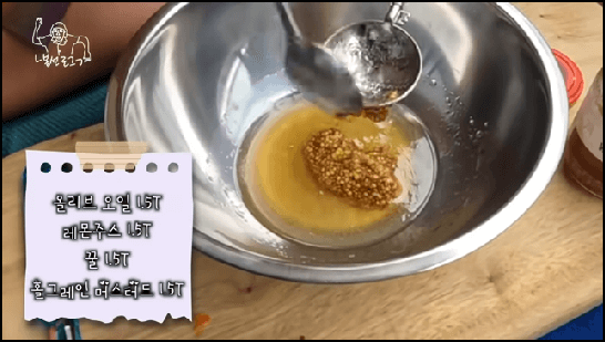 당근이 절여지는 동안 당근 라페 소스를 만듭니다. 소스는 재료에 나와있는 정량대로 모두 섞어주면 되는데요, 올리브오일 1.5T, 레몬주스 1.5T, 꿀 1.5T, 홀그레인 머스터드 1T를 넣고 섞어줍니다. 재료 란에는 홀그레인 머스터드가 1T라고 되어있는데, 드레싱 만드는 화면에서는 1.5T라고 되어있네요. 사실 맛의 별 차이는 없을텐데요, 홀그레인 머스터드를 좋아하시는 분들은 1.5T를 넣으시고 그렇지 않은 분들은 1T만 넣어도 충분한 것 같습니다.