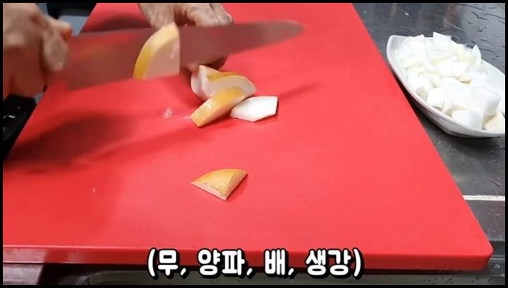 무, 양파, 배, 생강을 믹서기에 갈기 좋게 적당한 크기로 썰어줍니다. 믹서기에 모두 넣은 다음, 새우젓 110g을 같이 넣어줍니다. 까나리액젓 75g도 넣고, 사골국물 180g도 넣어줍니다.