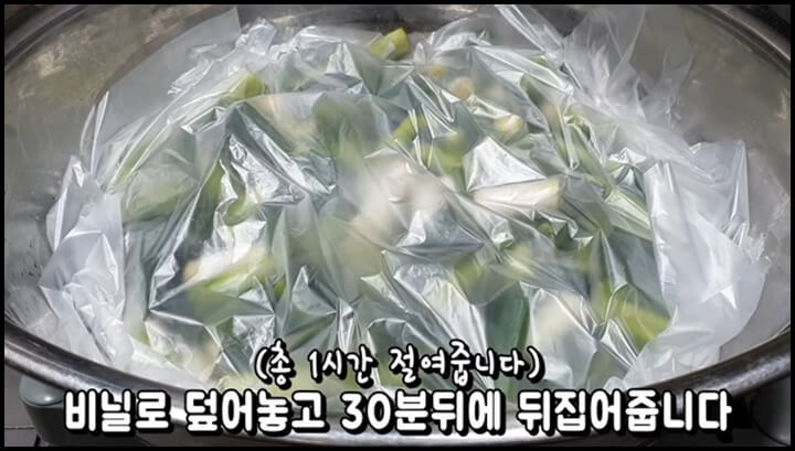 그런 다음 비닐로 덮어서 총 1시간을 절여주는데, 중간에 한번 뒤집어 줍니다. 30분쯤 되면 한번 뒤집어주고 남은 30분을 마저 절여줍니다.
