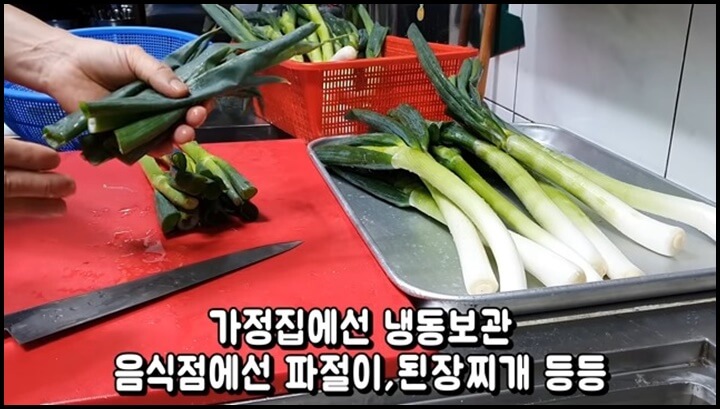 잘라낸 초록 이파리는 버리는 것이 아니라 쫑쫑 썰어서 냉동보관해 두었다가 음식에 사용하면 됩니다. 음식점에서는 파절이나 된장찌개 등에 사용한다고 합니다.