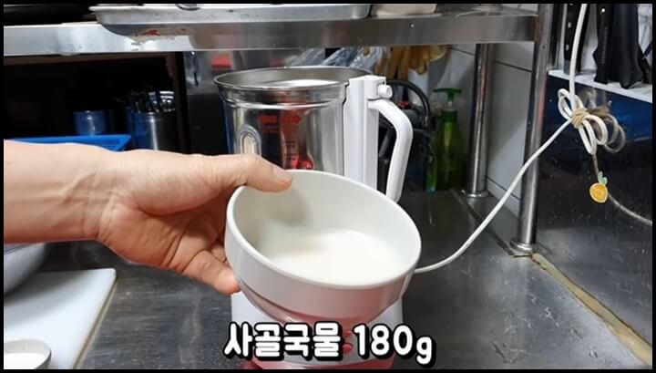 물에 찹쌀가루 2스푼을 넣고 거품기로 잘 풀어줍니다. 찹쌀가루는 그냥 넣어서 쑤는 것보다 이렇게 먼저 풀어주면 끓이기가 쉽습니다.