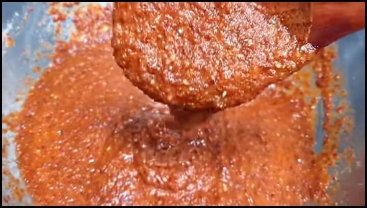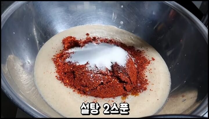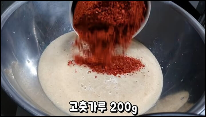믹서에 잘 갈아준 다음 그릇에 부어줍니다. 고춧가루 200g을 넣고, 매실액 3스푼, 설탕 2스푼, 깨소금 2스푼, 그리고 찹쌀풀 쑨 것도 모두 넣어줍니다. 양념을 골고루 잘 섞어줍니다.