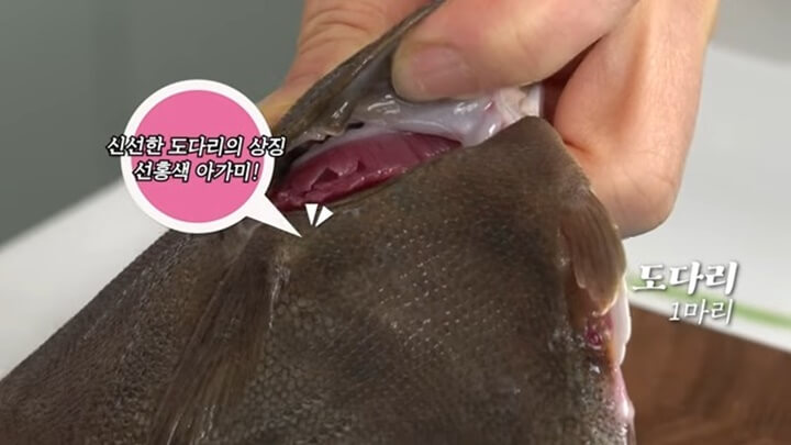 신선한 도다리를 고르려면 아가미를 보면 알 수 있어요. 선홍색 아가미를 가졌으면 도다리가 아주 신선한 것이에요.