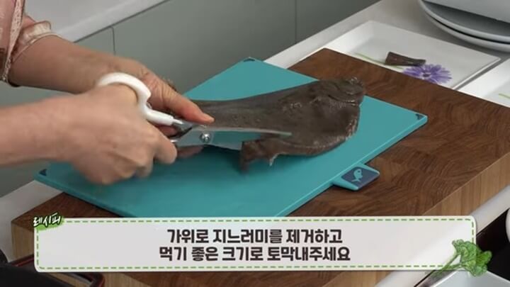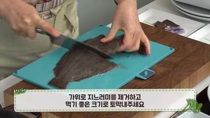 도다리는 알과 내장을 제거해주고, 가위로 지느러미를 모두 제거해 줍니다. 그런 다음 먹기 좋은 크기로 토막 내주고, 흐르는 물에 깨끗이 씻어줍니다.