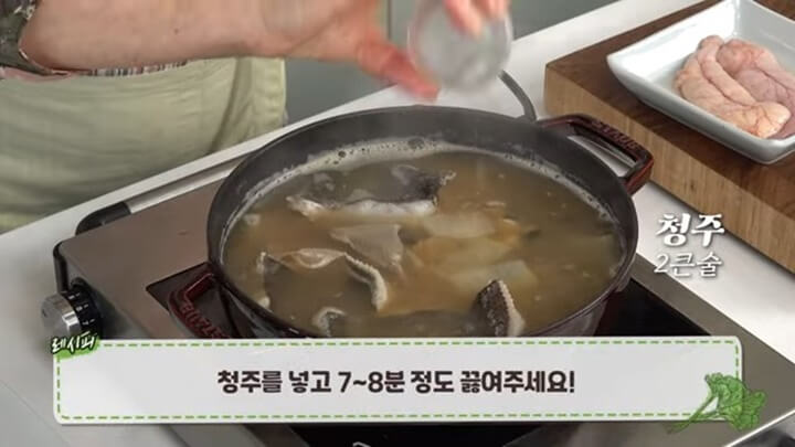 5. 도다리를 넣고 청주를 넣어 7-8분 끓이다가 도다리 알도 넣고, 다진 마늘 1 숟갈 넣고 해물 육수 팩을 꺼낸다.