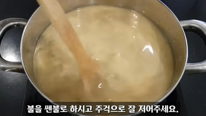 도토리가루 물을 냄비에 모두 다 붓고 불은 센 불로 해서 주걱으로 잘 저어줍니다. 한 방향으로 바닥까지 잘 저어줍니다.