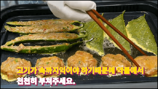 그런 다음 깻잎에 고기 소를 넣어주는데 이때 고기소를 가볍게 넣어주는 것이 훨씬 채소의 맛을 살릴 수 있어 맛있습니다. 불룩하게 넣는 것보다 납작만두처럼 얇게 넣어주는 것이 좋으며, 고추전 역시 고기 소가 볼록하게 올라오지 않게 평평하게 넣어주는 것이 좋습니다.