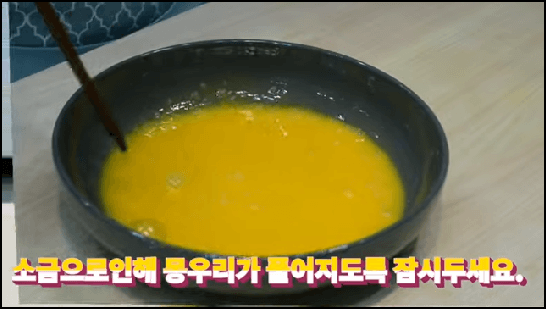 계란 2개를 깨뜨리고, 노른자 3알을 같이 섞어서 잘 풀어준 후 소금을 넣어 간을 해서 그대로 잠시 둡니다.
