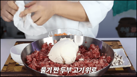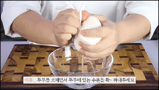 동그랑땡에 넣을 두부는 수분을 꽉 짜서 제거한 후에 넣어야 합니다. 면보에 두부를 싸서 손으로 꽉 짜서 물기를 제거해 줍니다. 그러면 자연스럽게 두부도 으깨지기 때문에 따로 으깰 필요가 없습니다.