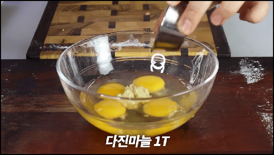 이제 만들어진 동그랑땡에 계란물을 입혀서 굽기만 하면 됩니다. 계란 4개를 넣고, 다진마늘 1큰술을 넣어서 잘 풀어줍니다. 계란물에 마늘을 넣게 되면 계란 비린내도 없애고 마늘 향이 은은하게 퍼져서 더욱 맛있어집니다.