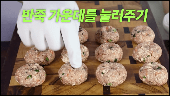 반죽을 적당량 떼서 동그랗게 빚어주면 되는데, 이때 동그랑땡 가운데를 손으로 살짝 눌러주면 모양이 훨씬 예쁘게 나옵니다. 위아래를 살짝 눌러서 가운데가 살짝 들어가면 됩니다.
