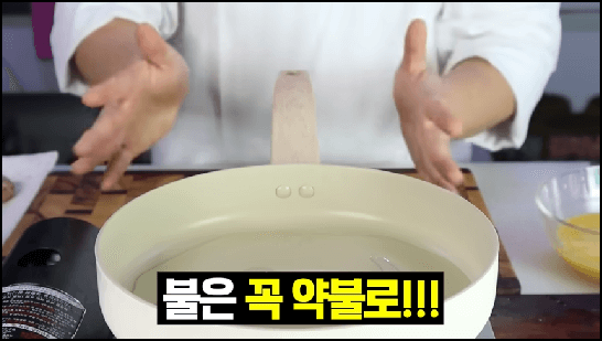 팬에 기름을 넉넉히 두른 후에 불은 꼭 약불로 맞춰 줍니다. 센불에서 굽게 되면 겉은 타고 속은 익지 않게 되니 꼭 약불에서 구워야 합니다.
