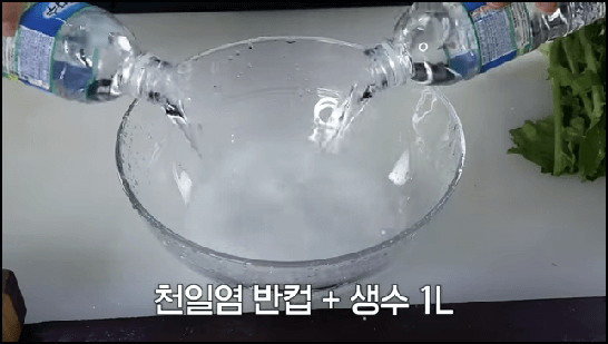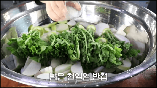 물 1리터에 소금 반 컵을 넣어서 완전히 녹여줍니다. 무를 절일 대야에 무와 무청을 모두 넣고, 소금물을 부어줍니다. 그리고 남은 천일염 반 컵도 골고루 뿌려줍니다.
