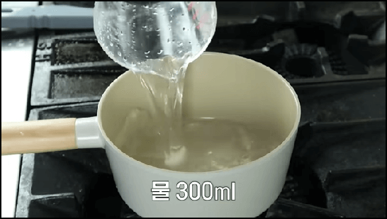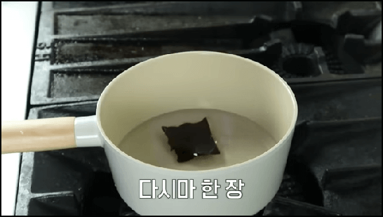 다시마 육수 물을 만들어 줍니다. 냄비에 물 300ml를 넣고 다시마 한 장을 넣어줍니다. 그런 다음 불을 켜서 끓여주는데, 물이 끓기 시작하면 5분간 끓인 후 불을 끄고 다시마는 건져냅니다. 이대로 한김 식혀줍니다.