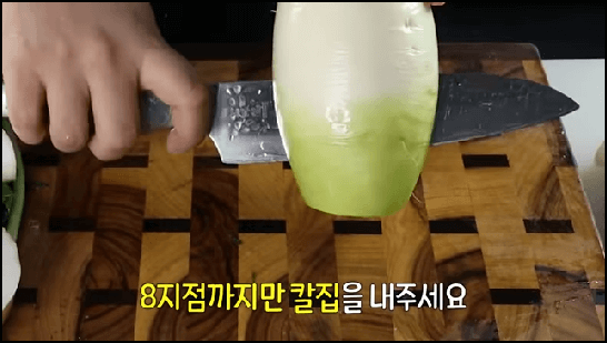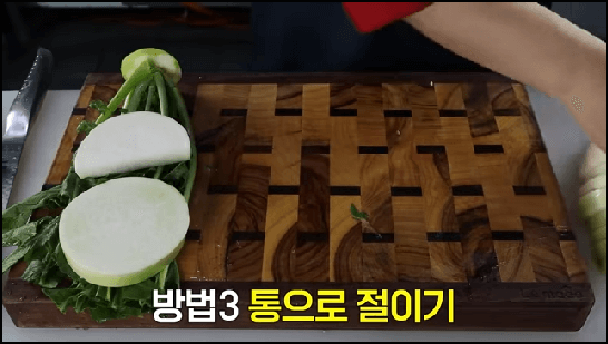 무 모양은 취향껏 자르면 되는데요, 원형 모양으로 적당한 두께로 자르거나, 무를 반으로 길게 자른 다음 반달 모양으로 잘라도 되고, 아니면 통째로 담가도 좋습니다. 통째로 담글 때는 무의 팔부까지만 십자로 칼집을 내주어 소금에 절여주면 됩니다. 어떤 모양이든 원하는 모양으로 잘라서 담으면 됩니다.