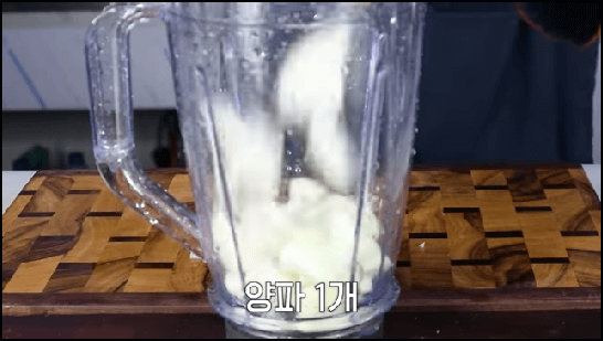 마늘 20톨, 생강 엄지손가락 크기 2톨, 양파 1개도 적당한 크기로 썰어서 믹서기에 모두 넣어줍니다. 생수 50ml를 같이 넣어서 곱게 갈아줍니다.