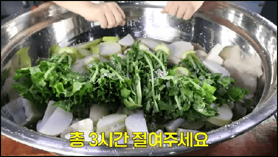 1시간마다 뒤적이며 절인 무는 3시간 뒤에 보면 무와 무청이 부드럽게 잘 휘면서 잘 절여졌습니다. 무 절인 물은 절대 버리지 말고 그대로 같이 사용합니다.