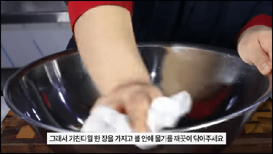 이제 동치미 육수를 만들어 봅시다. 먼저 그릇의 물기를 닦아서 제거해 줍니다. 수돗물을 완전히 제거해 주면 골마지 예방에 도움이 됩니다.