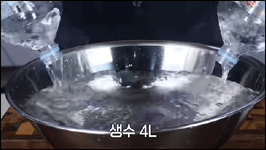 물 1리터를 준비하는데, 물은 꼭 생수를 준비합니다. 무를 절일 때 나오는 물은 무에서 맛있는 맛이 우러나온 것이기 때문에 버리지 않고 그대로 같이 사용할 것입니다. 그러니 절일 때 사용하는 물은 생수를 사용하는 것이 좋습니다.