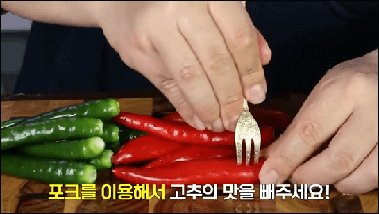 동치미에 들어갈 고추를 준비해 줍니다. 고추는 통째로 사용하는데, 그대로 넣는 것보다 포크로 콕콕 찔러서 고추의 맛있는 맛이 빠져나오도록 해 주면 좋습니다. 그러면 고추씨가 나오지 않아 지저분하지 않고 깔끔하며, 고추의 맛있는 맛은 빠져나오기 좋습니다.