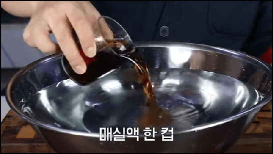생수 4리터를 붓고, 골마지 방지를 위한 소주 1컵을 넣어줍니다. 매실액 1컵과 다시마 우린 물을 넣고, 믹서기에 갈았던 양념을 모두 넣어줍니다.