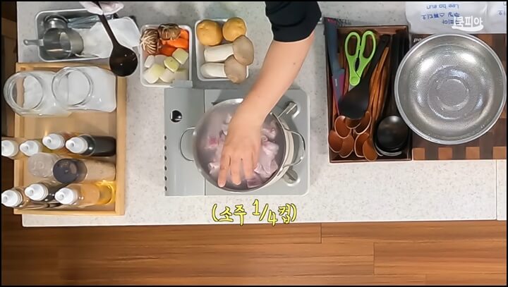 돼지갈비는 꼭 애벌 데침을 한 후에 조리해야 조리 시간도 짧고 잡내도 없어서 맛있게 만들 수 있습니다. 돼지갈비 초벌 데치기는 물을 팔팔 끓인 후 돼지갈비를 모두 넣고 소주 1/4컵을 함께 부어줍니다.