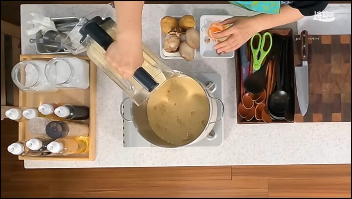 곱게 간 것을 냄비에 모두 붓고, 다시마 우린 물을 조금 넣어서 믹서에 남아있는 양념을 헹궈서 같이 넣어줍니다. 다시마 우린 물을 넣어주면 감칠맛이 더해져 더 맛있게 만들어집니다.