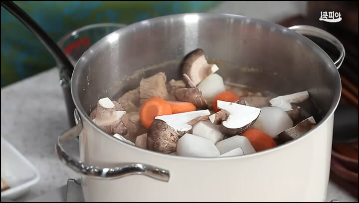 8분 30초 정도 끓인 후에 무와 당근, 표고버섯을 넣어 줍니다. 불은 중 약불로 하고 뚜껑을 덮어서 20분 정도 더 끓여줍니다.