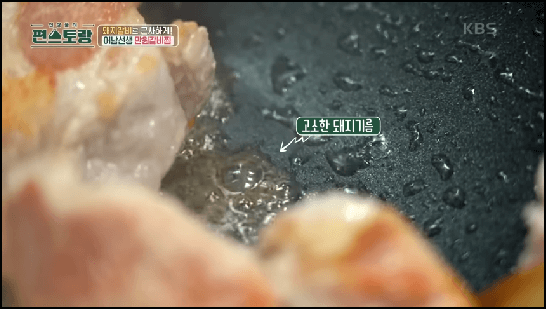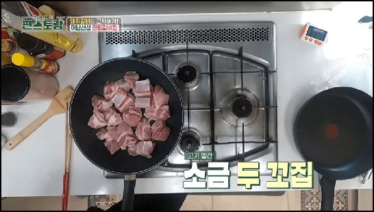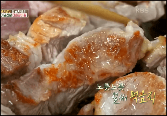 류수영 돼지갈비찜 맛있게 만드는 법은 돼지갈비를 구워주는 것입니다. 찜으로 푹 고아내는 것이 아니라 먼저 노릇하게 구워서 더 맛있게 만드는 것인데요, 예열된 웍에 돼지갈비를 넣고 구워주는데, 지방부분을 아랫면으로 가게 놓아줍니다. 소금 2꼬집을 뿌려준 후 기름이 나오도록 뒤집지말고 그대로 3분 두면서 굽습니다. 강불에서 3분 정도 구우면 바닥면이 노릇노릇해지고 돼지기름이 흘러나와 더 맛있어 보입니다.