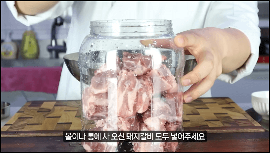 설탕과 미림을 넣고, 돼지갈비가 잠길 정도로 물을 넣은 후 뚜껑을 닫아서 가볍게 흔들어 줍니다. 그대로 30분 정도 핏물을 빼 줍니다.