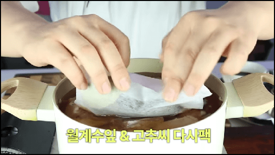 진간장 2큰술과 설탕 2큰술, 소주 100ml를 넣고 돼지갈비가 잠길 정도로 물을 부어줍니다. 월계수잎과 고추씨를 넣은 다시팩을 그대로 넣어주고, 불을 켜서 끓여줍니다.