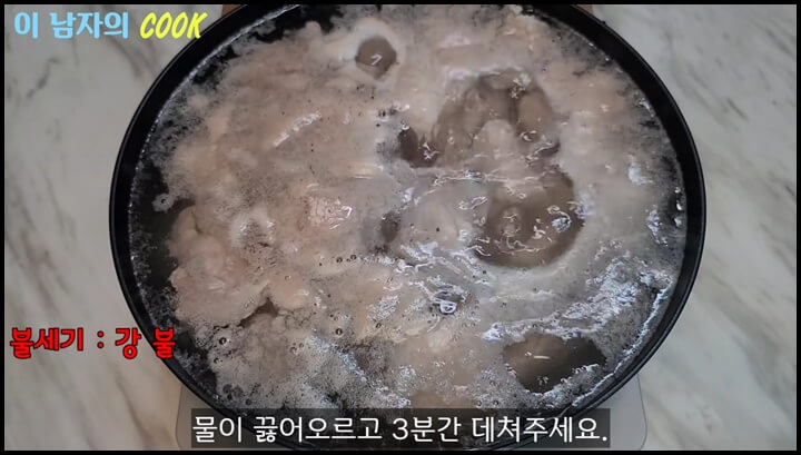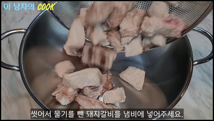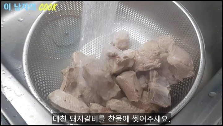 물이 끓어오른 뒤에 3 분간 데쳐줍니다. 그런 다음 건져내 찬물에 씻어줍니다. 돼지갈비에 묻어있는 불순물을 깨끗이 씻어냅니다.