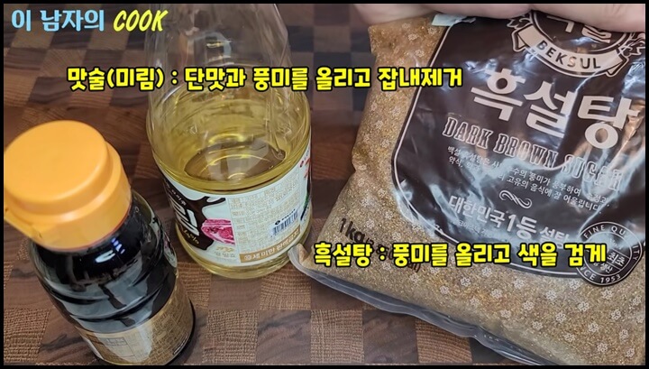 돼지갈비찜 맛있게 만드는 법의 핵심 양념은 양조간장, 맛술, 흑설탕인데요, 맛술은 단맛과 풍미를 올려주고 잡내를 제거하는 역할을 하고, 흑설탕은 역시 풍미를 올려주면서 색을 검고 진하게 만들어 줍니다.