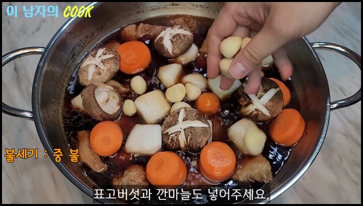 40분을 끓인 후에 무와 당근을 넣어줍니다. 그리고 표고버섯과 마늘도 함께 넣어줍니다. 건고추 2개를 넣어주면 칼칼함이 더해집니다. 손으로 찢어서 넣어주면 되고, 만약 건고추가 없으면 후추 1/2작은술을 넣어주면 됩니다.