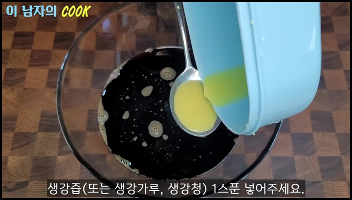 여기에 생강즙을 1스푼 넣어줍니다. 생강가루나 생강청을 넣어도 괜찮습니다.